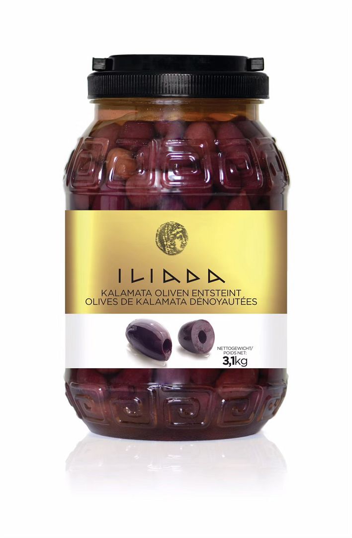 ILIADA採用來自希臘著名的卡拉馬塔市(Kalamata)的橄欖,享有P.D.O產區認證,果實飽滿不軟爛呈現Kalamata品種特有的深紫色,風味清香不酸澀,有橄欖界的玉荷包之稱。內容量3100公克 (固形量1600公克)。保存期限:未開封18個月。