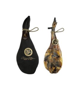 生火腿分級標準中的最高等級黑標,選用100%純正血統、全天然放牧且食用橡樹子的原生伊比利豬後腿(Jam?n)製成,油脂較前腿肉更為豐厚飽滿,咀嚼時紅肉部份帶有嚼勁,脂肪入口即化。去骨。