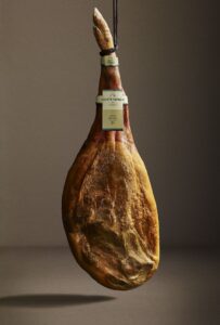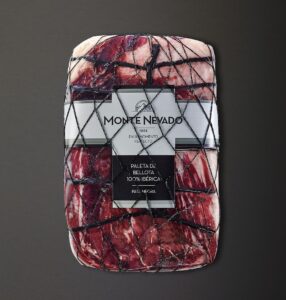 生火腿分級標準中的最高等級黑標,選用100%純正血統、全天然放牧且食用橡樹子的原生伊比利豬前腿(Paleta)製成。口感較有嚼勁,濃郁的堅果香氣。去骨。