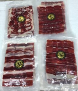 西班牙雪山牌100%橡子伊比利豬,肉質帶深紅色並富油質、充滿光澤,味道甜美帶核果香,並入口即化。後腿切片。