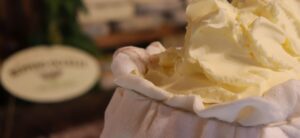 牛奶輕微發酵熟成後,形成鮮奶油,以手工攪拌,去除表面油脂,分離出奶油,再將奶油放入清水中搓揉,洗掉奶油中的脫脂乳。