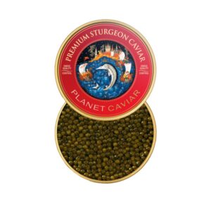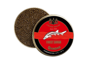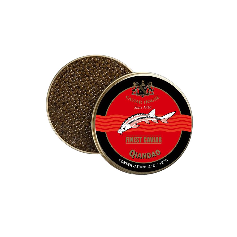 這款 Caviar House 千島湖奧賽嘉魚子醬,選用純種俄羅斯鱘魚培育而成。其魚卵具備標誌性的琥珀至棕綠色澤,質地韌度適中且塑型容易。