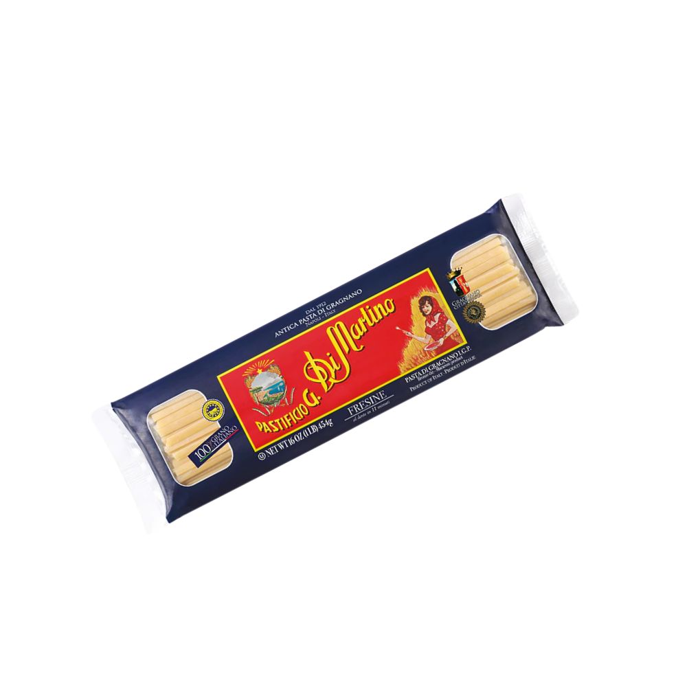 這款產自格拉尼亞諾並榮獲 PGI 地理標誌保護認證的 Fresine,是厚度與寬度皆優於細扁麵的高階麵體。其核心工藝採用傳統青銅模具擠壓,賦予表面極致粗糙的質地,能產生強大的物理吸附力,鎖住濃郁醬汁。選用 100% 義大利杜蘭小麥與在地山泉水,經低溫緩慢烘乾,使蛋白質含量達到優異的 14% 以上。這不僅賦予了麵條極具韌性與彈牙的咬勁,更因其純淨成分而極易消化。